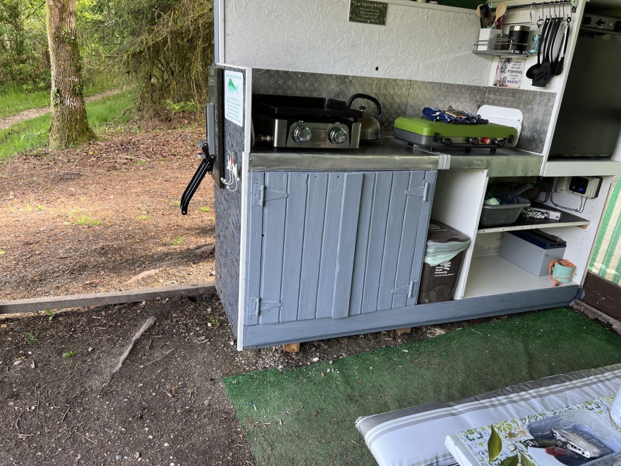 At our most popular swim we have further usb charging points. Here we have also added an outside kitchen area providing kitchen cupboards, with plates cutlery pots and pans etc. there is a two burner hob with small grill under and a griddle plate, also a small gas fridge. a picnic bench completes this area.